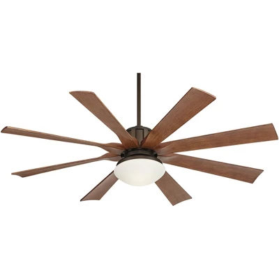 The Defender™ outdoor ceiling fan from Possini Euro Design® is rated for use in damp locations. It comes in a handsome oil-rubbed bronze finish motor and eight koa finish blades with a 60-inch span. An energy-efficient LED light kit is attached into the bottom and covered by a opal frosted glass shade that diffuses the lighting. A handheld remote control is included for operation.