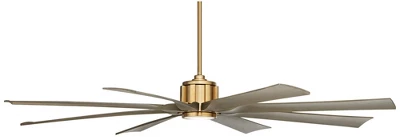 The Defender™ large outdoor ceiling fan from Possini Euro Design® is rated for use in damp locations. It comes in a soft brass finish motor and eight hand-painted weathered oak finish ABS blades with a 70-inch blade span. An energy-efficient LED light module includes a polycarbonate lens. A handheld remote control is included for operation.