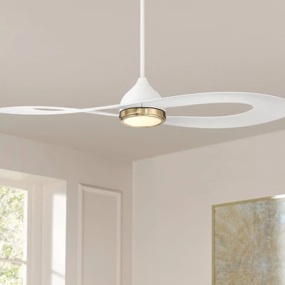 Gentle and graceful curves are here to impress with the Obi collection of contemporary modern ceiling fans from the Possini Euro Design® brand. Two molded ABS blades in matte white finish swoop around the motor in wide curves with open spaces to create the comfortable sensation of air circulation. The matching matte white finish motor features a soft brass finish accent for a splash of metallic color. The Obi collection is completed by an integrated CCT LED module, and all functions can be operated with the included hand-held remote control. The Obi collection is damp location rated for both indoor and covered outdoor use.