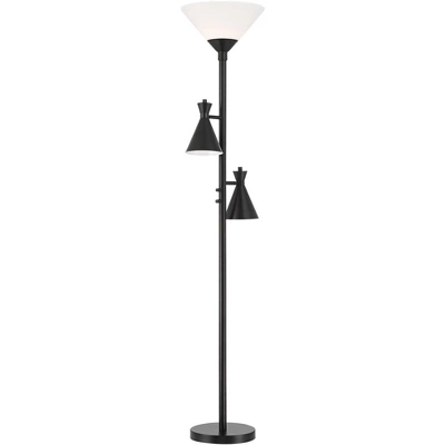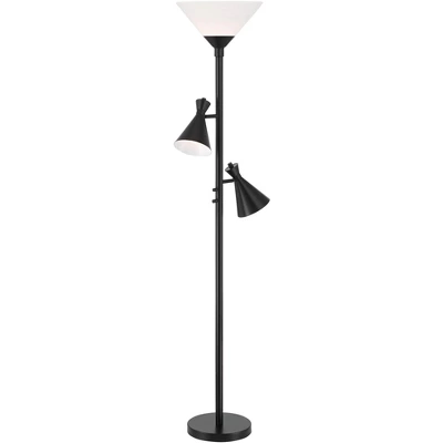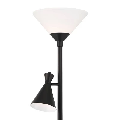 The Ballard floor lamp combines the functionality of a torchere lamp with that of a task reading lamp. You get general room lighting from the top torchiere style light, which directs light towards the ceiling. The twin adjustable side lights give you bright task lighting for reading and other activities. The base and pole are in a black finish, with a white torchiere glass shade up top.