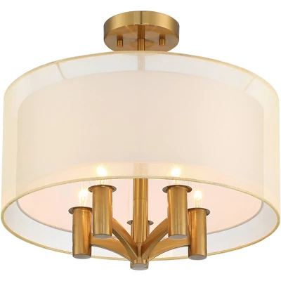 This semi-flushmount ceiling light offers a chic and simple design. It has a double drum shade, with a sheer outer shade over a white linen shade, and is enhanced by gentle warm brass accents. The result is an elegant look, perfect for living room, dining room, or kitchen.