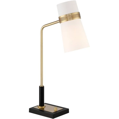 Focus light where you need it with this antique brass and black desk lamp featuring a USB port. From the Possini Euro Design brand, the lamp’s luxe design includes contrasting black and antique finishes over its metal construction. A dimmer switch on the base lets you control the light with ease, and a USB port on the back allows you to charge smart phones and other devices while you work. Move the shade left, right, up or down to best suit your needs.