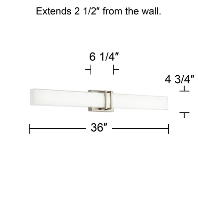 - 36″ wide x 4 1/2″ high. Extends 2 1/2″ from the wall. Backplate is 6 1/4″ wide x 4 3/4″ high.
