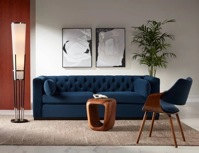 Make a cosmopolitan upgrade for a bedroom or living room with this contemporary modern floor lamp. In a satin black finish with brushed nickel accents, the metal frame consists of a series of rods that rise out of a round base, supporting a tall white linen shade in a slightly tapering conical silhouette. The result is a stylish uplight floor lamp with a beautifully dramatic look.