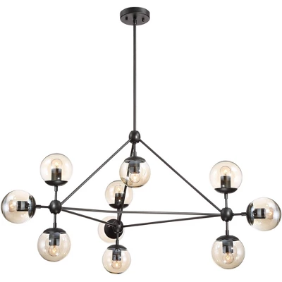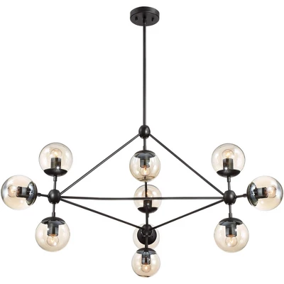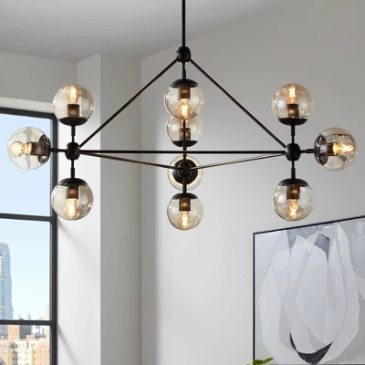 Decorate your living space with the beautifully modern look of this black ten-light chandelier. It comes in an open geometric frame made of several angular rods, resulting in an unusual design that draws the eye. The vintage-style cognac glass globes create a welcoming diffusion of light. This design is perfect for a Mid-Century Modern or upscale loft setting.