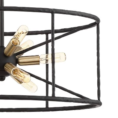 A black finish covers the textured metal frame of this La Vista drum nine-light pendant by Possini Euro Design®. The minimal style lends itself to complementing contemporary living spaces. Each bulb (not included) sits in a gold housing to stand out on this striking pendant light.