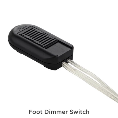 - 8′ clear silver cord. Black foot dimmer switch (for top light only) located in cord 30″ from base of lamp. Each side light has on/off rotary switch on head.