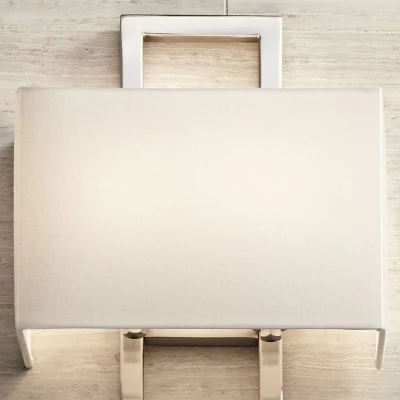 This modern wall sconce is as beautiful as it is simple. An open rectangular frame in a brushed nickel finish is paired with a horizontal rectangle half-shade for a light, airy look. The shade is made of a shimmery faux silk material that is designed to catch the light. Designed to take two bulbs, it provides excellent lighting for a hallway, bedroom, or bathroom space.