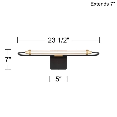 From the Possini Euro Design® brand, the Nikola bathroom vanity light presents a vintage tube lamp aesthetic. An integrated LED module creates a delicate light bar, spreading energy efficient illumination. The matte black frame and backplate are further enhanced by gold finish accents, adding a splash of charm. A great addition to a modern or vintage bathroom space, especially when mounted over a mirror or vanity space.