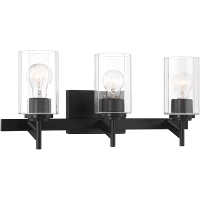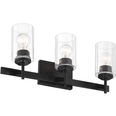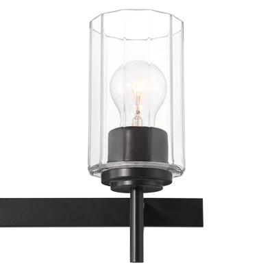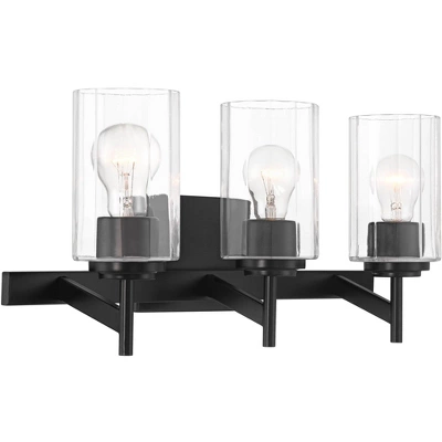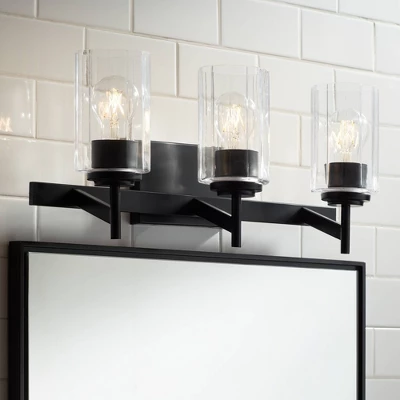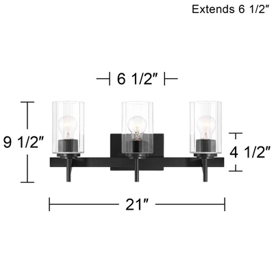 Modern minimalist is here to teach a new lesson of elegance with the Evette collection of lighting from the Possini Euro Design® brand. This three light bathroom vanity light features a simple black finish frame and backplate, enhanced by classy clear glass shades. Within each shade, a single bright bulb shines with unfiltered illumination, ready to bring welcome lighting to your home.