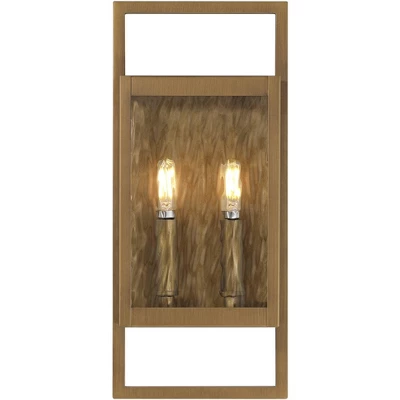 From the Jerry collection by Possini Euro Design®, this outdoor wall light fixture offers a stylized modern look for your home. It comes in an aged brass finish aluminum frame, with clean, straight lines and intersecting rectangles that form an eye-catching silhouette. Rain glass panels give a full view of the two bulbs used within, making decorative light bulbs a smart choice for this fixture.