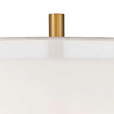 - Sleek brass and black finishes. Metal construction base and pole. Double layer linen and sheer drum shade. Round black riser. 8-foot long silver cord.