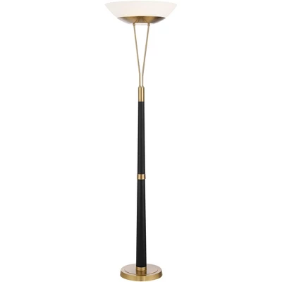 Mid-Century luxury styling combined with modern vibes makes up the Venture antique brass and black torchiere floor lamp. From the Possini Euro Design brand, this floor lamp features contrasting antique brass and black finishes over its metal construction. A bowl-shaped glass shade tops the design, offering ideal lighting for any room.