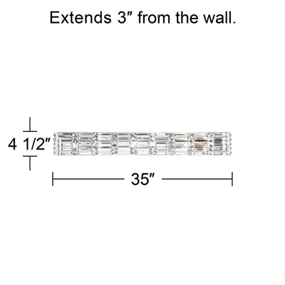 - 35″ wide x 4 1/2″ high. Extends 3″ from the wall.